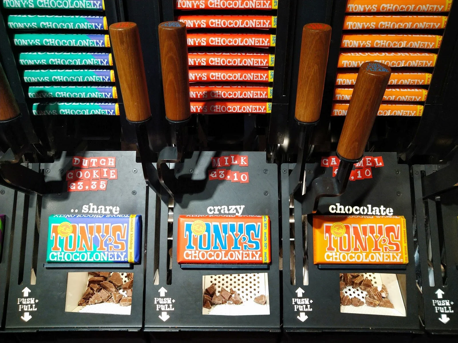 De “chocomaat” is een mechanische chocoladerepen dispenser. Hij bevat maarliefst 2000 repen! Met 40 hendels, twee voor iedere smaak, kan hij je voorzien van een hele reep of een blokje chocola, om een smaak eerst te proberen (check de video).